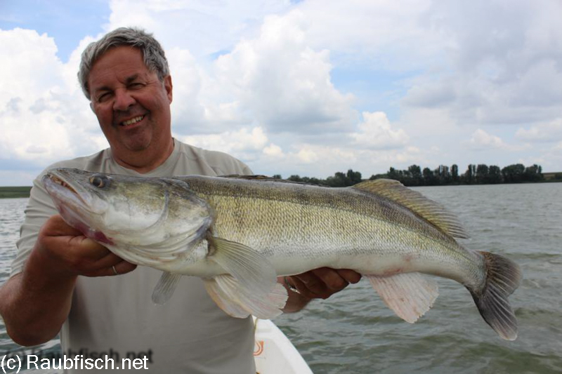 Beide Boote blieben zunächst dicht beisammen und schon bald flogen die Köder Richtung Horizont. Nein, ok, meist Richtung Ufer um die Kanten abzufischen. Alles blieb ruhig, keine Aktionen waren zu verzeichnen. Naja, nun mal nicht ungeduldig sein! Danach trennten sich unsere Wege. Ich fuhr mit Dieter in einen etwas weiter entfernt liegenden Bereich, und es dauerte auch nicht lange und der erste Zander schnappte sich meinen Köder. Was für ein brachialer Einschlag in der Rute, dafür fahren wir hierher. Die rumänischen Zander haben irgendwie ein bisschen mehr drauf als ihre niederländischen Artgenossen. Wir konnten in den nächsten 3 Stunden 14 schöne Zander fangen, als Topfisch landete Dieter sogar einen 76er, welcher für dieses Gewässer schon eine Ausnahme darstellt. Oder war es diesmal anders? Dazu später mehr…