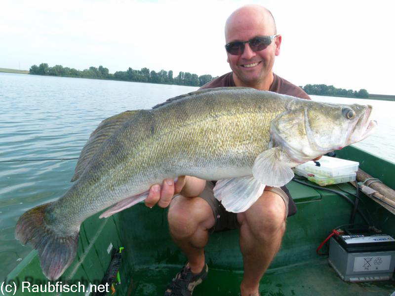 Nur kurze Zeit später, fast an der gleichen Stelle, wieder ein heftiger Anbiss. Und wieder zeigte der Fisch ungeahnte Kräfte zu Beginn des Drills. Schon wieder ein Wels war unser Tipp, aus meinem Mund kam nur: „Bitte nicht schon wieder so ein Viech!“ Dann aber ähnelten die Kopfschläge doch eher an einen Zander, und ehe wir unsere Erwartungen so richtig ändern konnten, kam auch schon eine fette Zandermutti an die Oberfläche. So sehr es mir egal gewesen wäre wenn der Wels noch ausgehakt wäre, so nervös wurde ich bei diesem Anblick. Da wir hier keinen Kescher zur Verfügung haben und alle Fische mit der Hand gelandet werden müssen, war der Adrenalinpegel noch etwas höher als gewöhnlich in diesen Situationen. Es klappe – der Fisch war sicher in meinem Griff! Wow, fett ! Das Maßband zeigte zwar „nur“ 83cm, aber dieser Zander war wohl der urigste seiner Art den ich bisher fangen konnte.