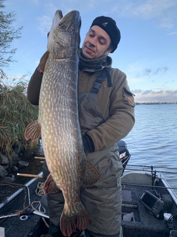 Dann kam eine absolute Granate bei Sven. Schon im Drill war klar, dass der Fisch ein anderes Kaliber hat, denn er kam nur sehr zögerlich vom Boden hoch. Wir waren mega happy, als sich endlich der Kescher um den Fisch schloss. Vor uns lag eine außergewöhnlich fette Hechtdame von 112 cm, die wir auf ca. 15 Kilo schätzten.