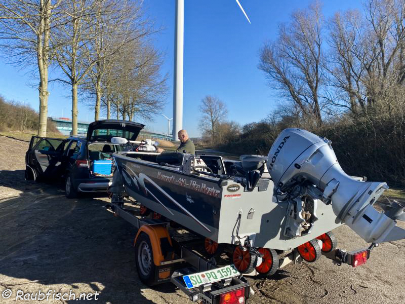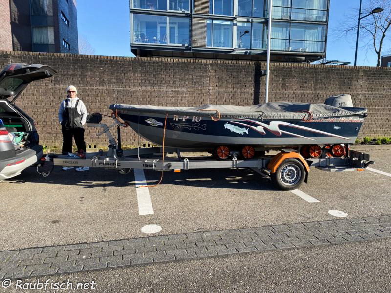 Auch hier wurde der Wind zunehmend unangenehm (kalt war er ohnehin schon), und wir entschlossen uns ein Poldergebiet anzusteuern, welches wir uns schon zu Hause auf der Karte angesehen hatten. Tja, was soll ich sagen? Der zu Hause am PC angezeigte "Durchgang" existierte nicht, meine Wasserkarte im Echolot hatte nicht gelogen. So standen wir vor einer Kaimauer und mussten wieder umkehren. Wieder raus auf den Fluss? Nein, für heute hatten wir (vor allem aber ich) die Nase voll. Wir slippten aus und genossen den schönen Restnachmittag bei einem Spaziergang in der Stadt. Zweiter Angeltag in diesem Jahr, und auch wenn dieser sehr kurz war, tatsächlich für mich auch der zweite Vollschneider. Na das läuft ja gut an...
