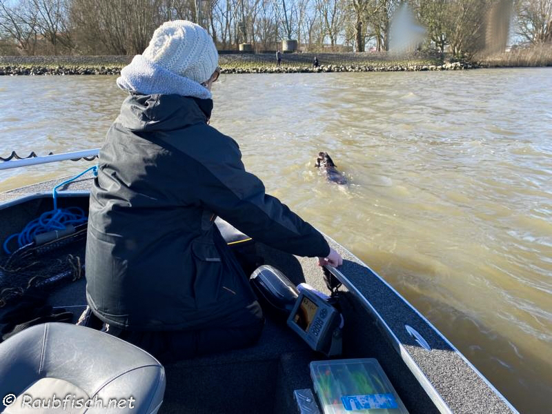 Nicht wirklich. Der Fluss zeigte sich kalt, trüb und unproduktiv. Das einzig spannende war ein "entschwommener" Hund, dessen Besitzer am Ufer verzweifelt nach ihm riefen. Das Tier hatte mitten auf dem Fluss völlig die Orientierung verloren und jaulte bereits erschöpft vor sich hin. Wir lenkten ihn mit dem Boot in Richtung Ufer, wo sich das Besitzerpaar erleichtert wieder um ihn kümmern konnte. Rettung geglückt!