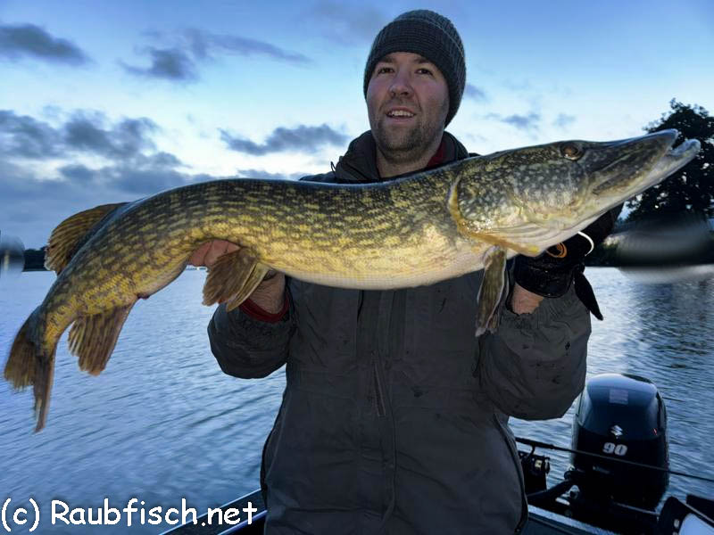Bei mir gab es einen Fehlbiss und auch Dieter konnte einen Anbiss nicht verwandeln, dann aber wurde meine Rute regelrecht zur Seite gerissen. Gleich zu Beginn ahnte ich, dass hier ein guter Fisch am Haken hing. Das bewahrheitete sich auch, denn wenig später konnte ich einen 114cm Hecht vor die Linse halten.