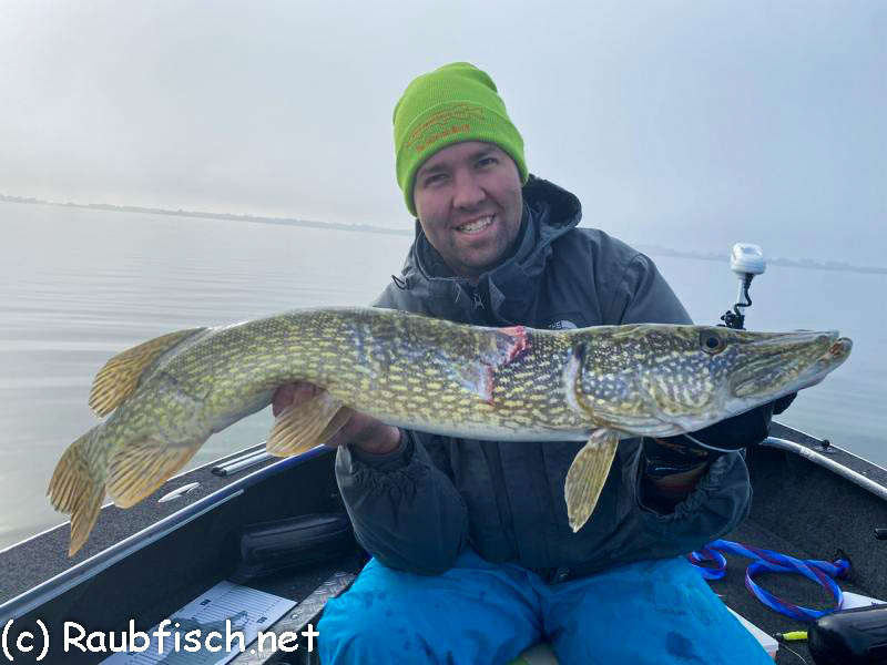 Nachdem Daniel und ich die Position ein wenig verändert hatten (durch den Nebel hatten wir den Platz, vielmehr die Orientierung des Bootes nicht optimal getroffen), gab es auch bei uns wieder Aktion. Und was für einen tollen 113cm Hecht hatte Daniel da gefangen!